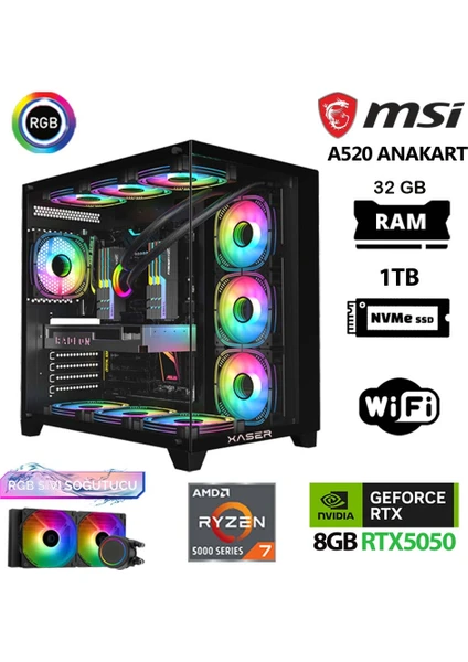 Xaser Delux X07 Ryzen 7 5700X 32GB Ram 1TB M.2 NVMe SSD 8GB RTX5050 Sıvı Soğutmalı Oyuncu Bilgisayarı